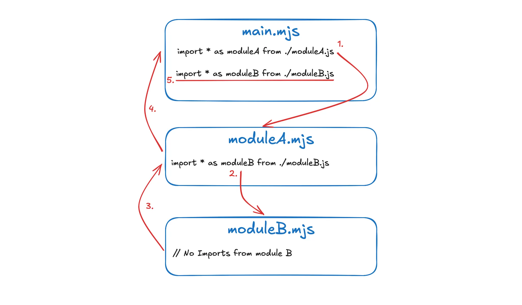 이 과정에서 코드는 의존성의 최하위부터 실행되며, 마지막으로 main.mjs가 실행된다.