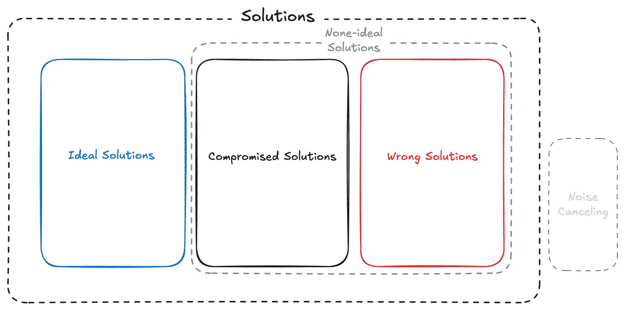 Web Frontend에 예를 들자면 사실상 이상적인 해결법의 한계를 잘 알아야한다. 하위호환성을 위해 존재하는 수많은 Paradox, OS/브라우저/브라우저 버전/ 기기 성능, 과 같이 심각하게 나뉘어진 환경 과 같은 환경적인 한계가 존재 하므로 애초에 달성하기 쉽지 않은 목표이기 때문이다.