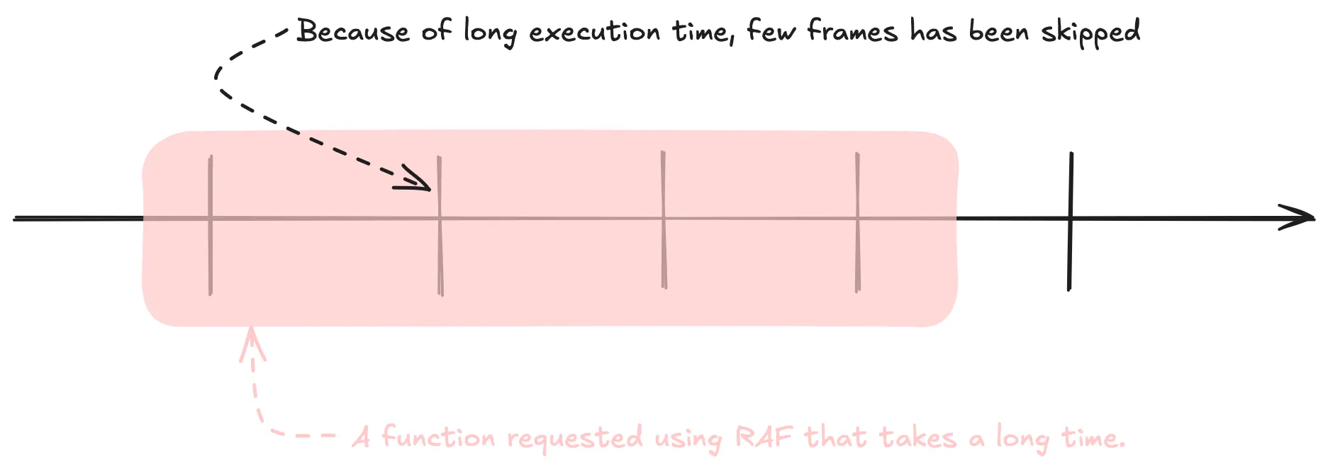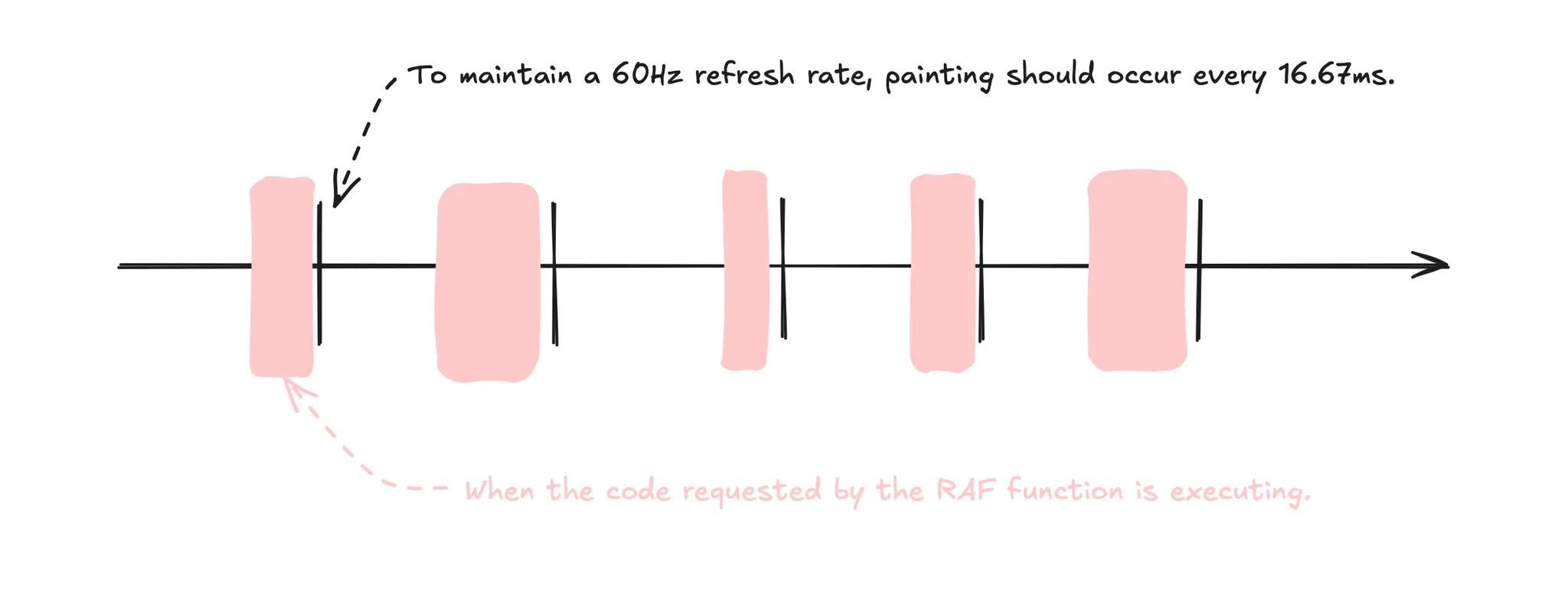 위에서 언급했듯이, requestAnimationFrame도 정확히 매 16.67ms마다 실행을 보장하지 않는다. 이는 setTimeout과 같은 함수들이 지정된 시간에 정확히 실행되지 못하는 것과 같은 원리이다.