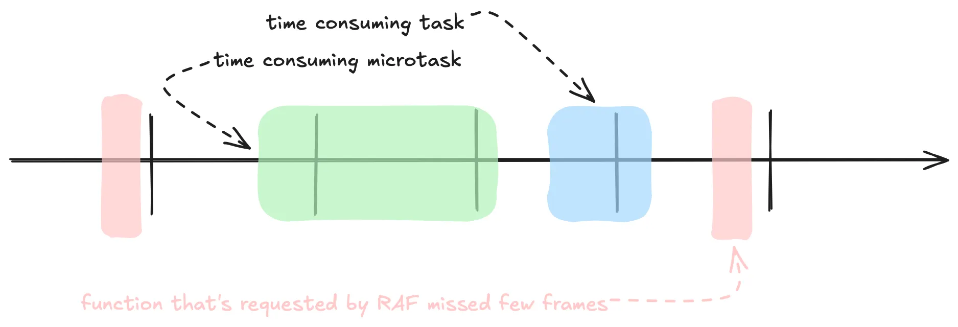 위의 사례와 유사하게, requestAnimationFrame으로 전달된 함수 자체의 실행 시간은 짧지만, 이벤트 루프에 의해 추가된 microtask나 task가 오래 걸리는 경우, requestAnimationFrame으로 요청된 함수는 그만큼 프레임이 지연되어 실행된다. 이로 인해 부드러운 애니메이션이 보장되지 않을 수 있다.
