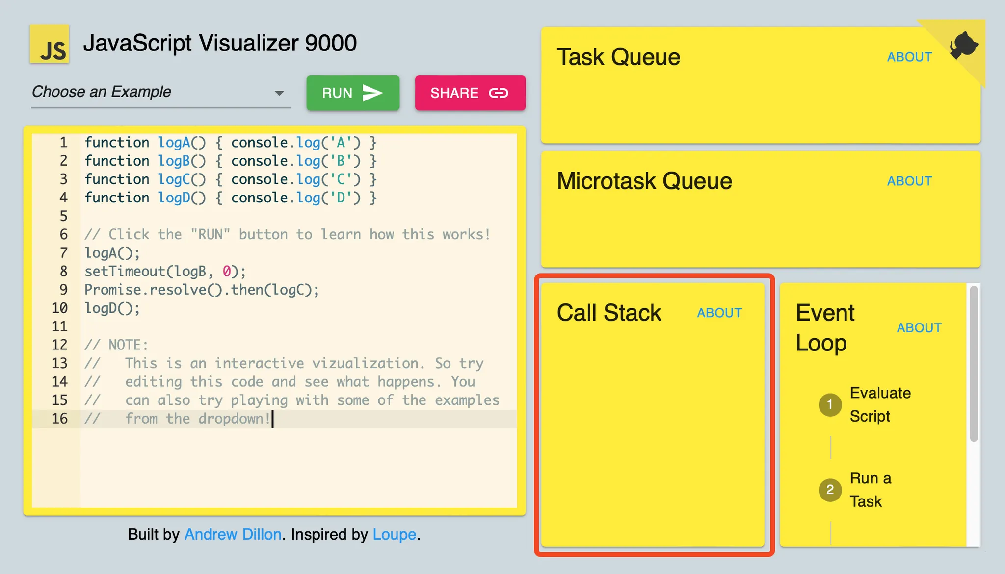 한 번쯤 봤을 법한 JavaScript Visualizer 9000에서 “Call Stack”은 실제로 “Execution Context Stack”이라는 표현이 더 정확하다.