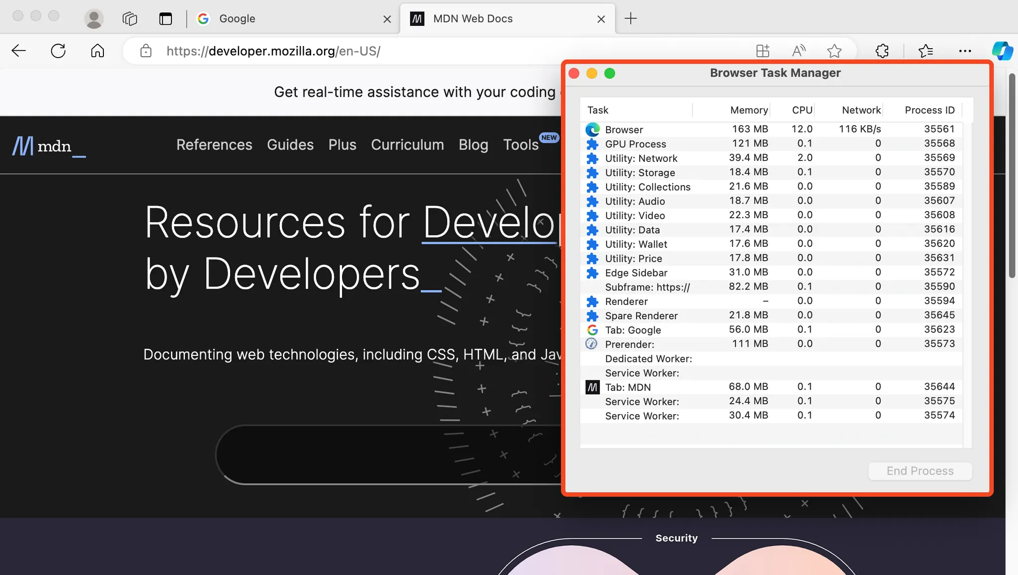 Chromium 기반 브라우저의 경우, 메뉴에서 “More Tools” → “Task Manager”를 통해 사용 중인 브라우저가 생성한 프로세스를 확인할 수 있다.