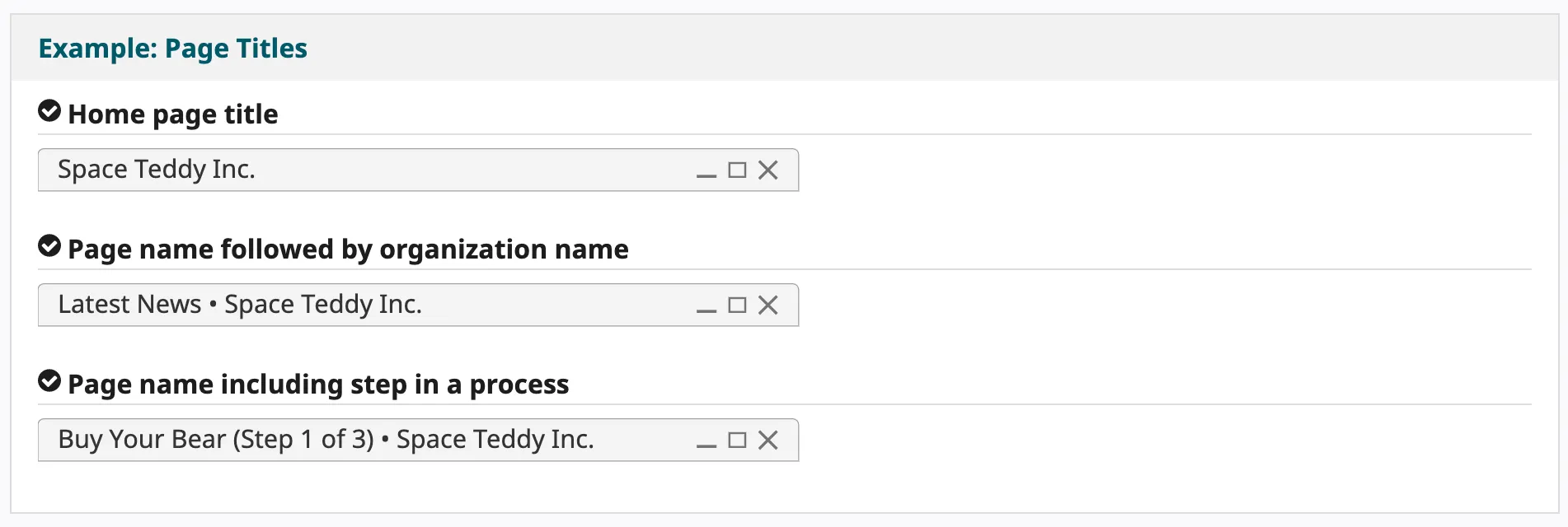 페이지 타이틀은 예를들어 컴퓨터 디렉터리에 존재하는 문서의 파일 이름과 비슷하다. 파일이 좋은 이름을 가지고 있지 않다면 해당 파일을 다시찾기 힘들고 사용성이 떨어지듯이, 페이지에도 좋은 타이틀이 필요하다.
