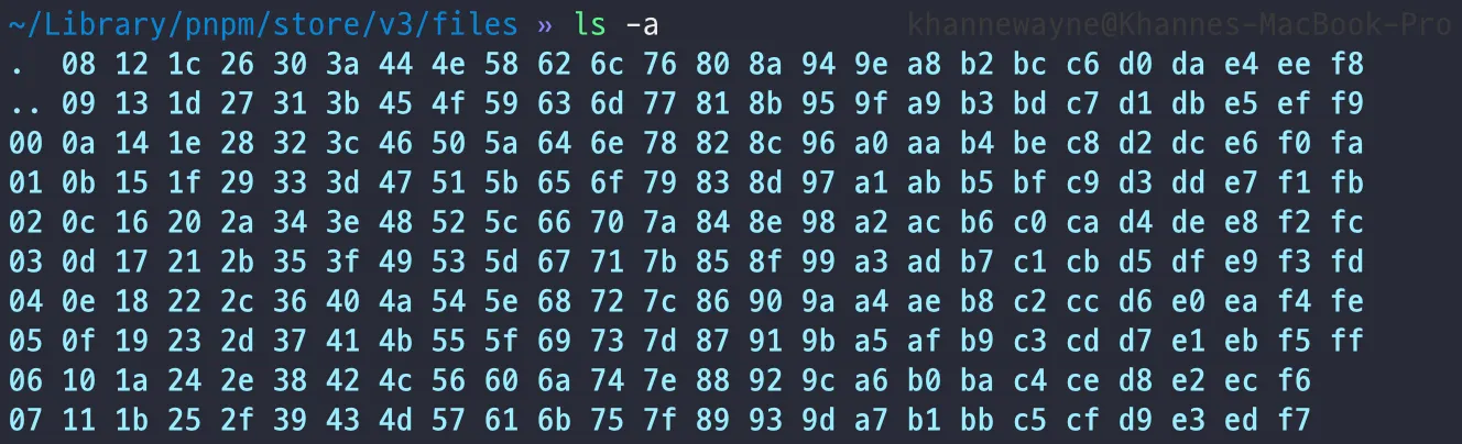 cd ~/pnpm/store/v3/files # CAS에 실제 패키지 파일들이 설치된 위치로 이동