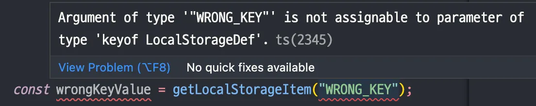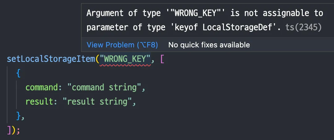 사전에 약속되지 않은 키또는 값을 조작하려 시도할 경우 바로 타입에러가 출력되는, “아 이거 키값이 뭐였더라?”라고 할 필요 없이 타입 추론되는걸 찾아가면 되는 로컬 스토리지 조작 함수가 탄생했다.