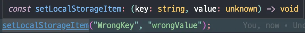 파라미터에 “설정하려는 localStorage의 키가 string이여야 하며 그 값은 unkown이다.” 라는 타이핑만 됐다.