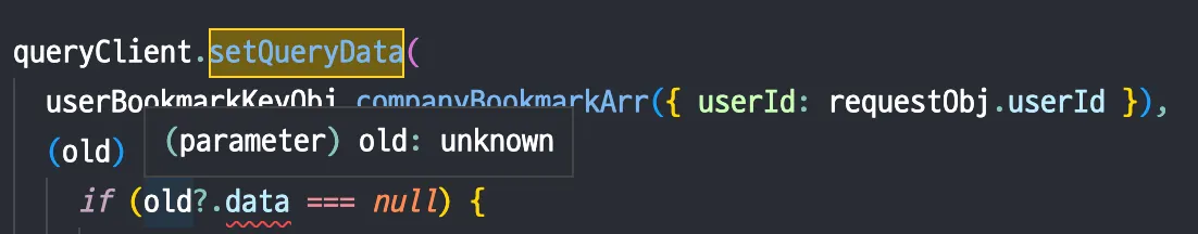 generic으로 설정된 TQueryFnData가 전달되지 않으면 setQueryData내에서 updater function의 값들은 unknown으로 추론된다.