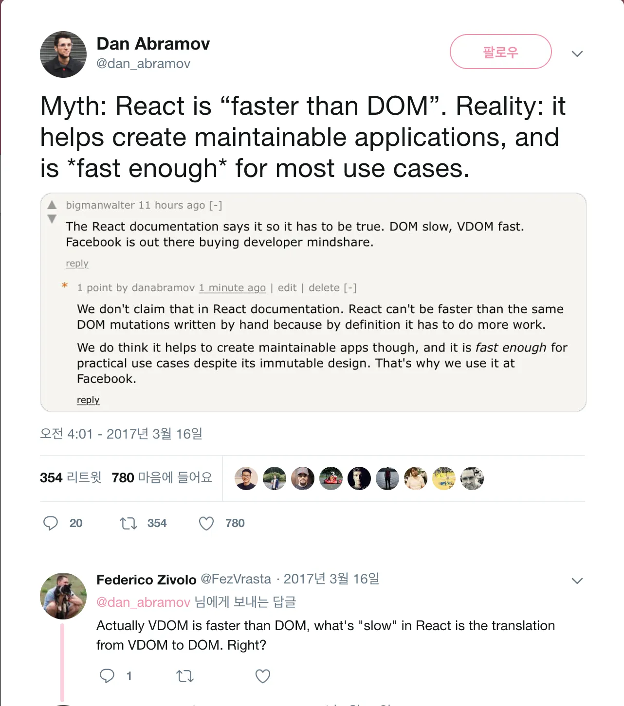 “대부분의 사용 케이스에서 충분히 빠르다”로 해석 될 수 있다. 그렇다 react는 빨라서 사용하는게 아니라 SPA의 특징 또는 장점(컴포넌트화, 앱과 같은 사용성)들을 가지고 있지만 충분히 빠르기 때문에 사용하는 라이브러리다.