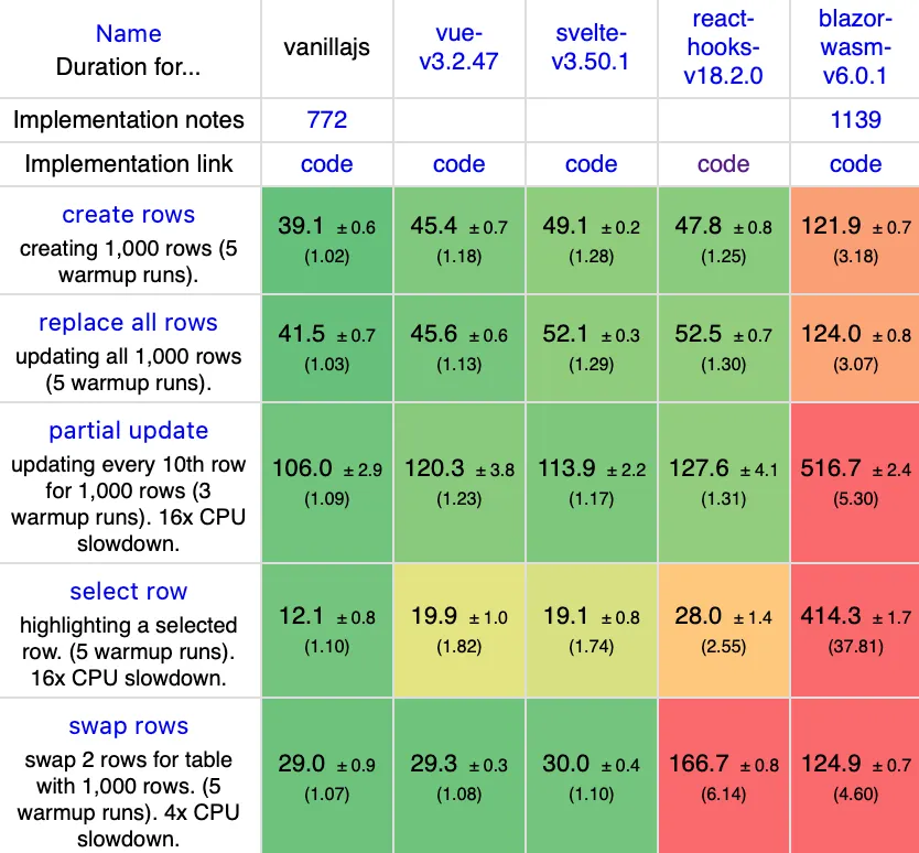 vanillajs, vue, svelte, react-hooks, balzor-wasm을 크롬 112(글 작성시 최신 벤치마크 결과)기준으로 같은 DOM 조작에 대해 확인한 벤치마크 결과다.