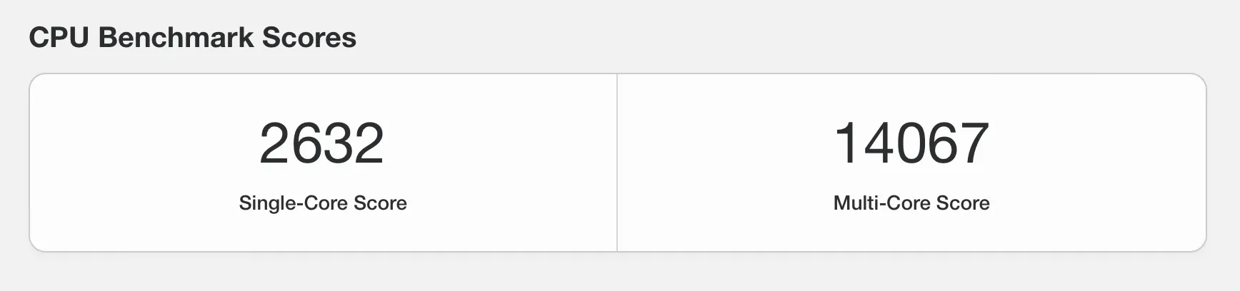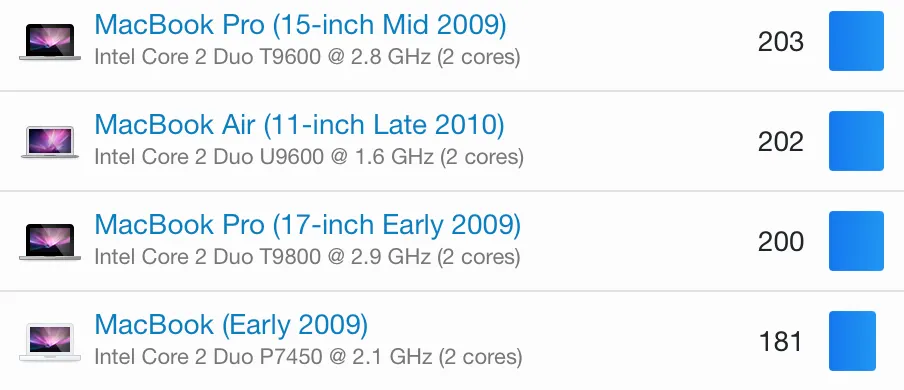 위 테스트는 14인치 맥북 프로에서 진행됐다. 23년식 2023 macbook pro 14의 geekbench 싱글코어 점수는 2632이다. → 16배 느린 케이스면 164.5점인 CPU를 찾으면…